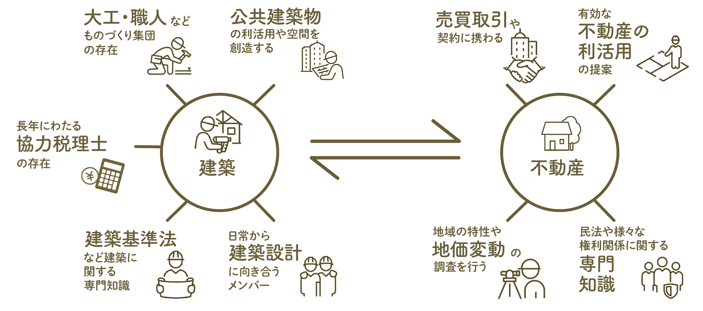 私たちが掲げる「建築から不動産を考える」というコンセプトは、それぞれの専門家がタッグを組み、